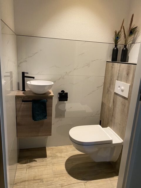 Van de Bilt en Heubacher biedt als tegelzettersbedrijf ook badkamer en toilet totaal aan. Zie ook hier een project van ons waarbij de kwaliteit hoog in het vaandel staat. Bij dit project is ervoor gekozen om een marmerlook tegel te combineren met de warme uitstraling van een houtlook tegel en een mooi contrast te bieden met de zwarte details van het sanitair. Dit alles leidt tot een strak design dat in geen enkel huis zou misstaan.
