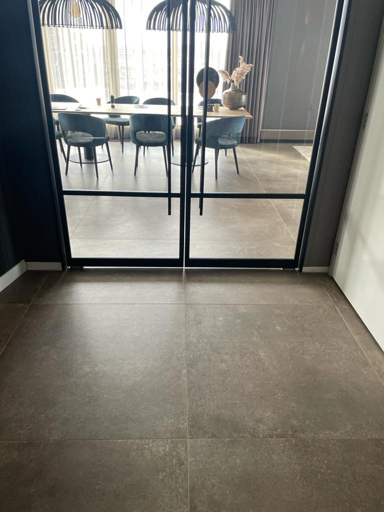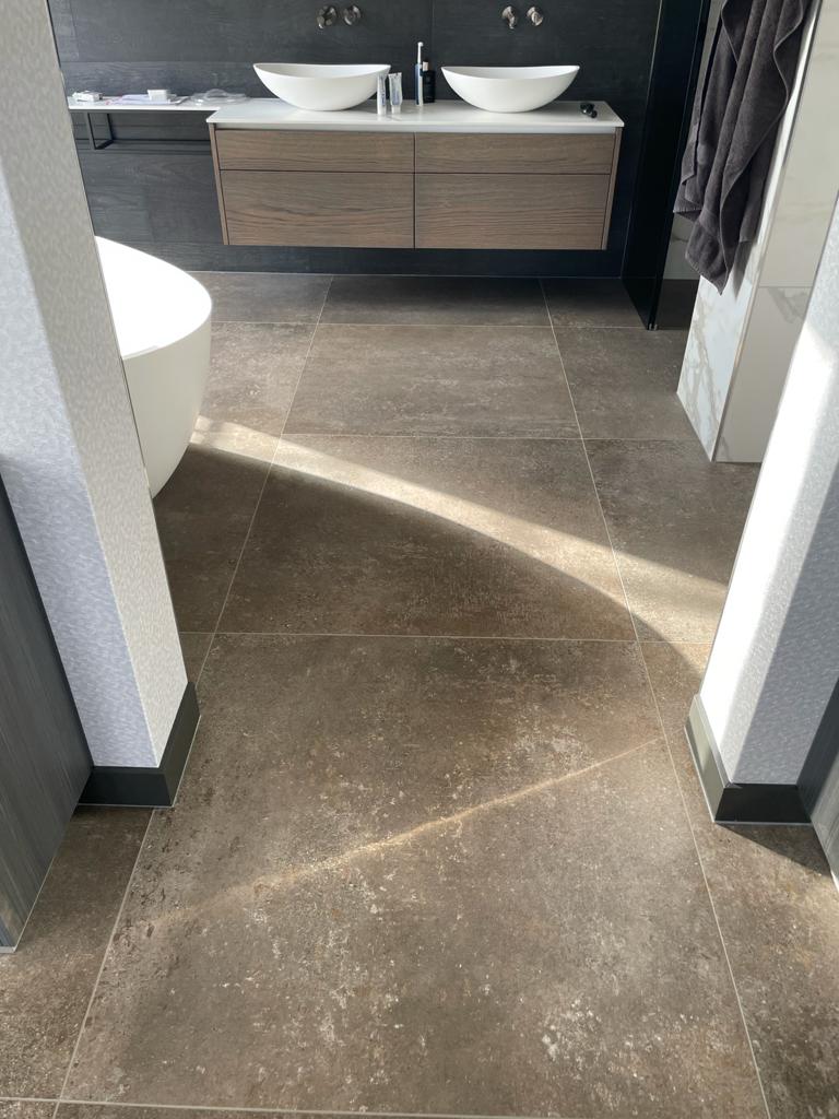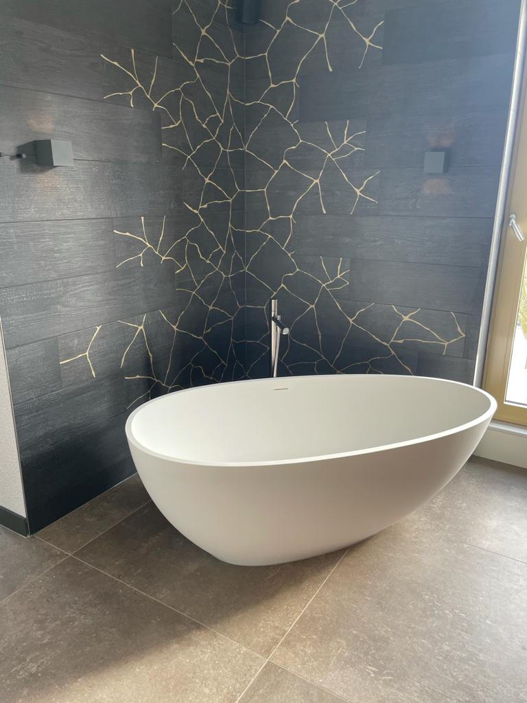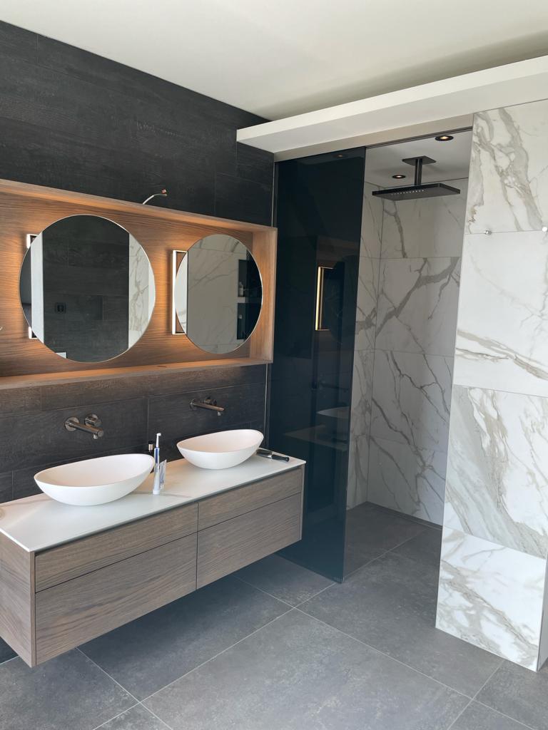 Bij deze luxe badkamer kregen wij de opdracht speels om te gaan met de verschillende formaten XXL tegels. Dit geeft de badkamer een bijzonder strak design. De toegepaste Kintsugi tegel achter het bad in combinatie met de lichtere marmerlooktegels en het houtlook meubilair geeft een hele andere impressie aan een badkamer.